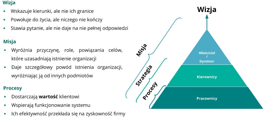 Kluczowe, zawsze okazuje się wdrożenie wizji, misji oraz procesów strategicznych w organizacji. Nie wdrożone w odpowiednim czasie, szybko dają o sobie znać; stagnacją firmy lub co gorsze następuje spadek potencjału Firmy na rynku w którym organizacja funkcjonuje.