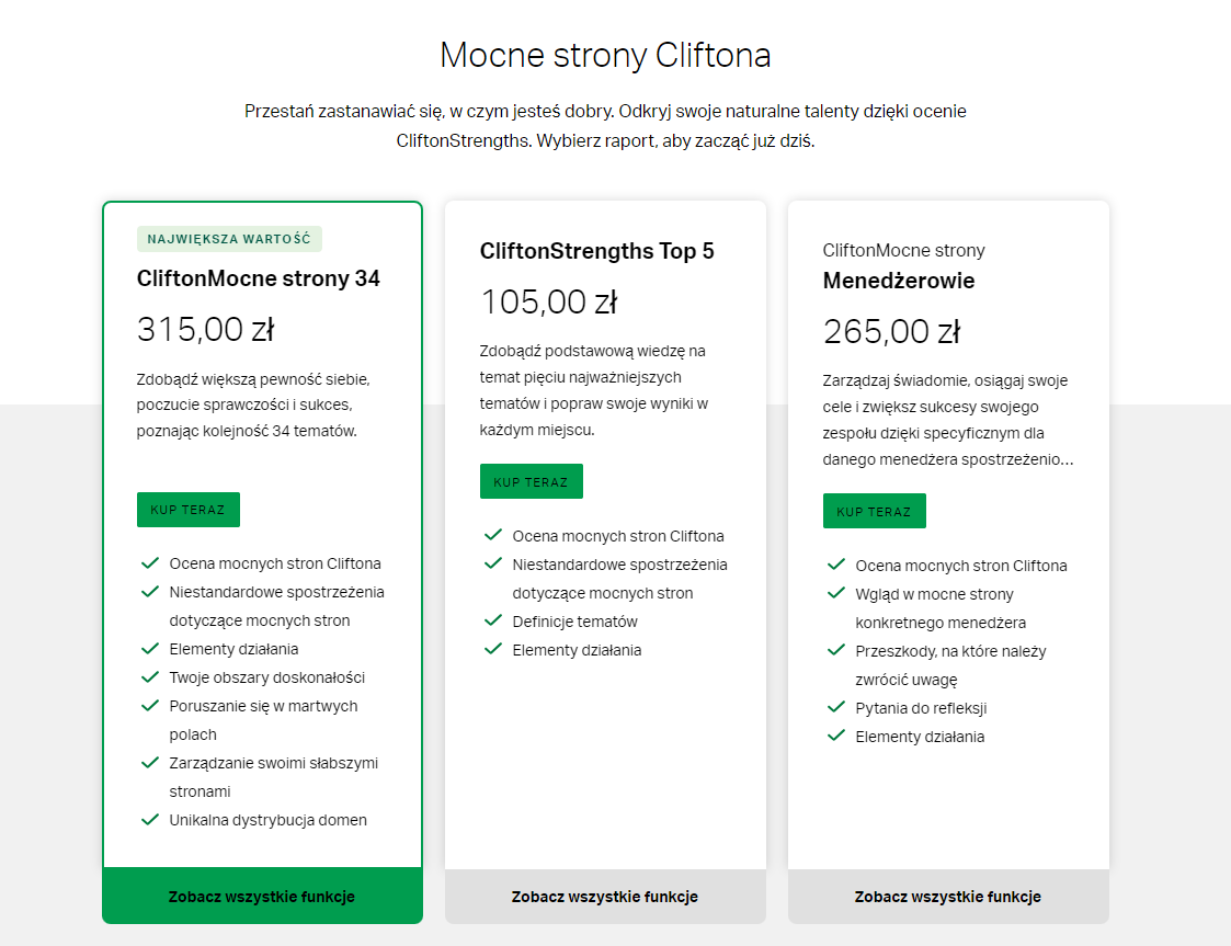 W przypadku zainteresowania pakietami wraz z coachingiem koniecznie skontaktuj się z nami - z uwagi na nowe zasady store.gallup nie ma możliwości wykupu opcji w postaci kart, voucherów itp.
